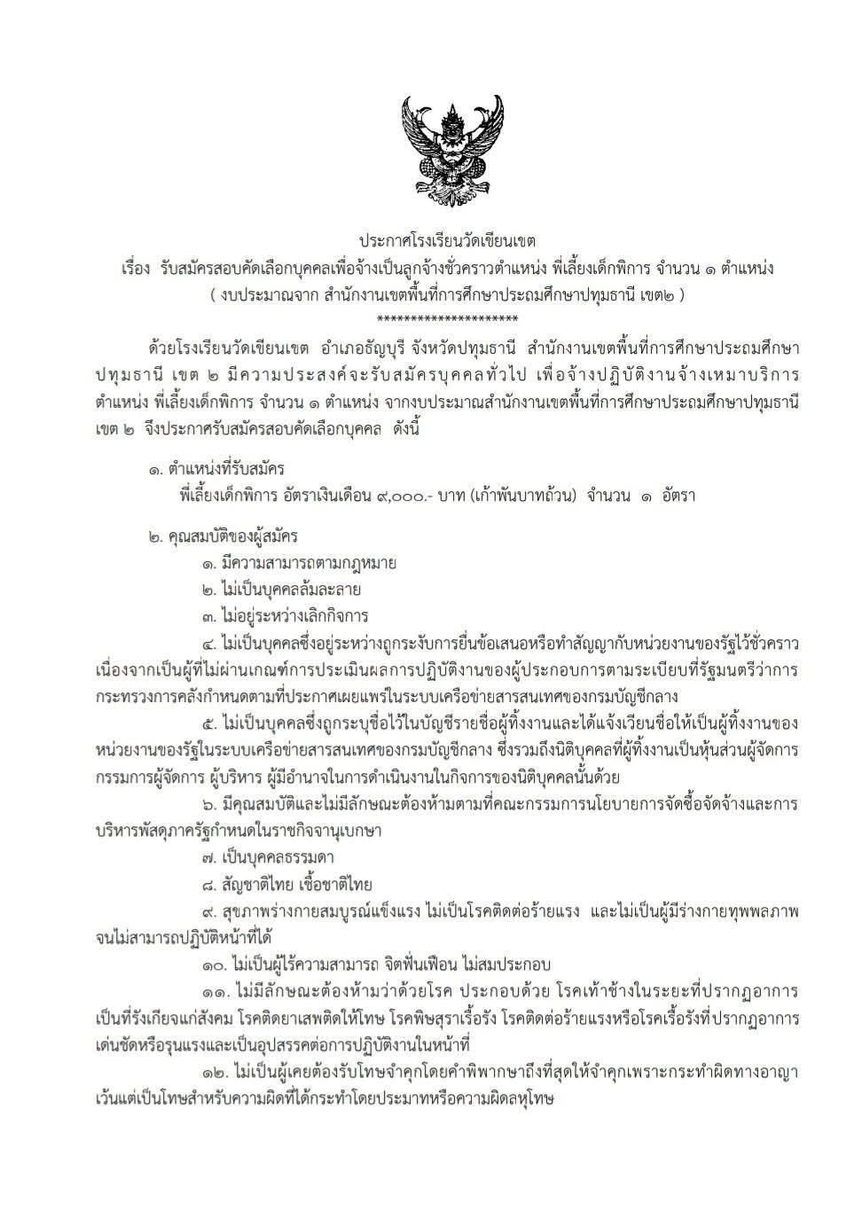ประกาศรับสมัครงาน: โรงเรียนวัดเขียนเขต เปิดรับสมัครบุคคลเพื่อเลือกสรรเป็นลูกจ้างชั่วคราว ตำแหน่ง "พี่เลี้ยงเด็กพิการ"